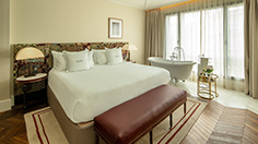 The 111 rooms and suites were designed to channel the noble homes of 1950s Madrid, with midcentury-modern furniture, patterned rugs and porcelain bathtubs interwoven with modern conveniences such as a Bose sound system and the thermoregulatory HOGO sleep system (which is supposed to impart health benefits). Most rooms have fireplaces, sumptuous marble bathrooms and an open balcony with a sitting area.